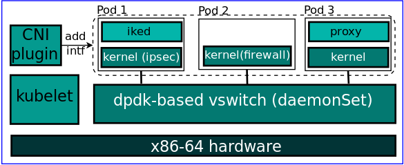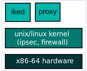 The data plane is the unix/linux kernel which does the IPsec encryption/decryption. The stateful firewall processsing is done in the kernel using iptables/NETFILTER framework. The IKE processing is done in userspace, and is shown as iked (IKE daemon) in the figure. Strongswan IKEv2 daemon is a popular choice. The proxies for the various applications are also present in userspace.