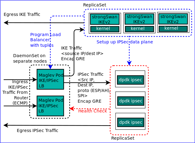The Kiknos approach has certain implications when the number of backends changes dues to failures, or additions. In Kiknos, in case the number of backends changes, then the ECMP router will send the IPsec traffic to another data plane pod. The new pod gets the IPsec session details from a separate datastore that is shared by the data plane pods. In our proposed implementation, the Maglev pods maintains a connection table which is sticky. Even if the number of data plane pods change, the Maglev pods will refer to the connection table before attempting a consistent hash. So, the Maglev pods maintain the state, and we avoid a data store that can be a potential bottlneck.