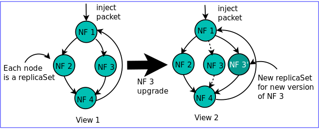 Our solution for a service chain is a versioned graph, and each packet has a corresponding position within this graph. So, each packet meta-header has a graph view id,. The next NF will be determined by the forwarding code.
